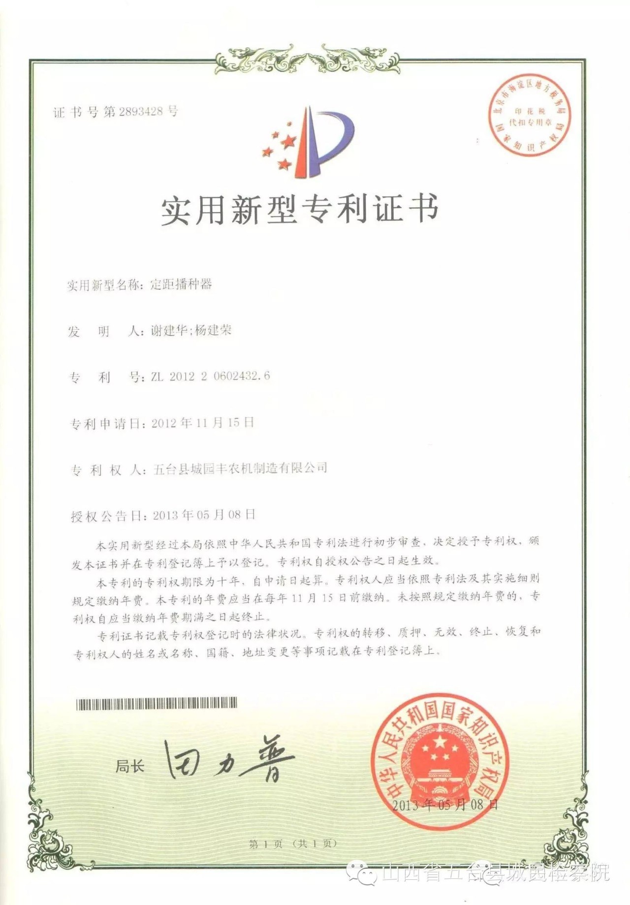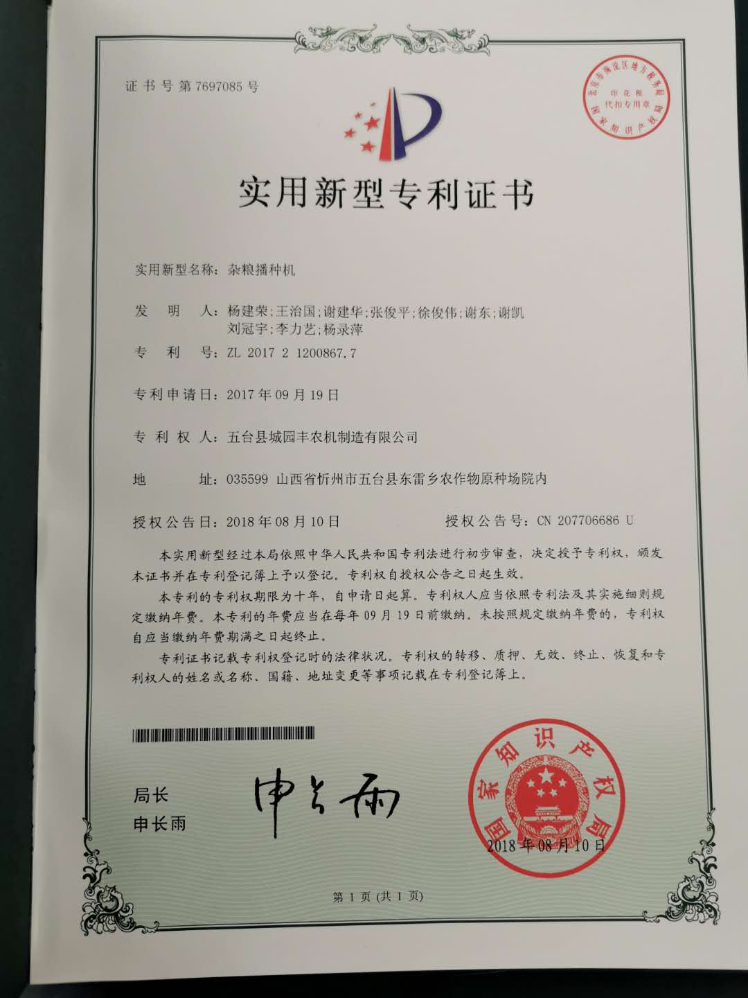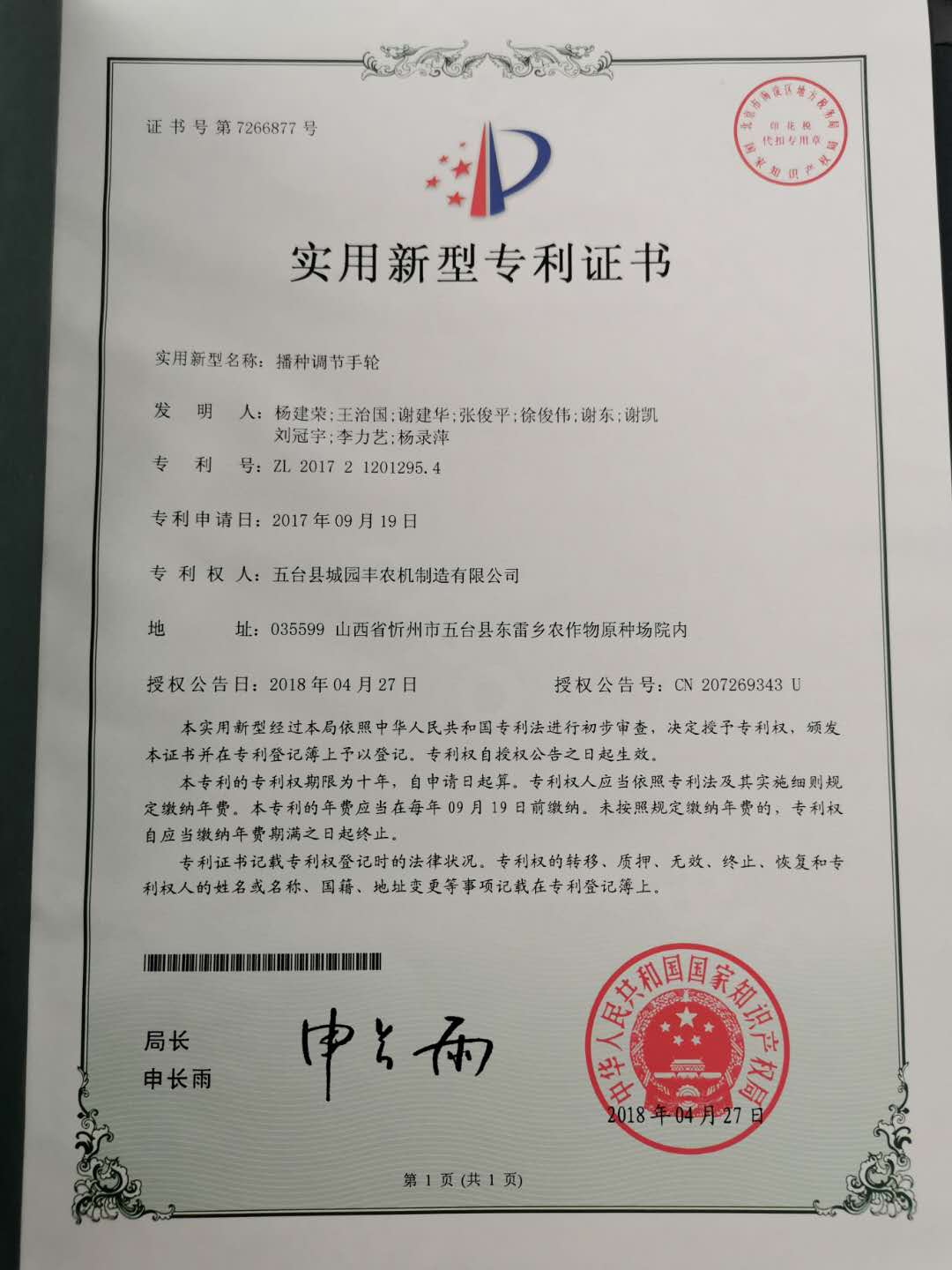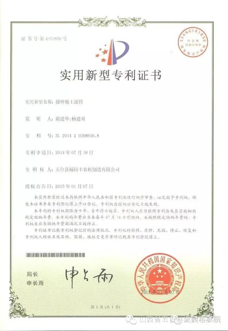公司的主要產(chǎn)品玉米鋪膜精量播種機的研發(fā)制造推廣獲得了2013年忻州市科學(xué)技術(shù)進步獎、一項發(fā)明專利及5項實用新型專利等。